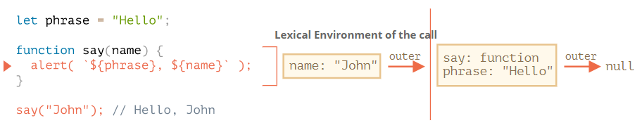 지역 렉시컬 환경엔 sayHi가 없기 때문에 외부 렉시컬 환경에서 sayHi를 찾는데, 함수 호출 시점에 외부 렉시컬 환경의