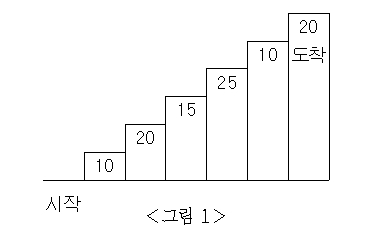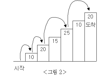 예를 들어 <그림 2>와 같이 시작점에서부터 첫 번째, 두 번째, 네 번째, 여섯 번째 계단을 밟아 도착점에 도달하면 총 점수는 10+20+25+20=75점이 된다.