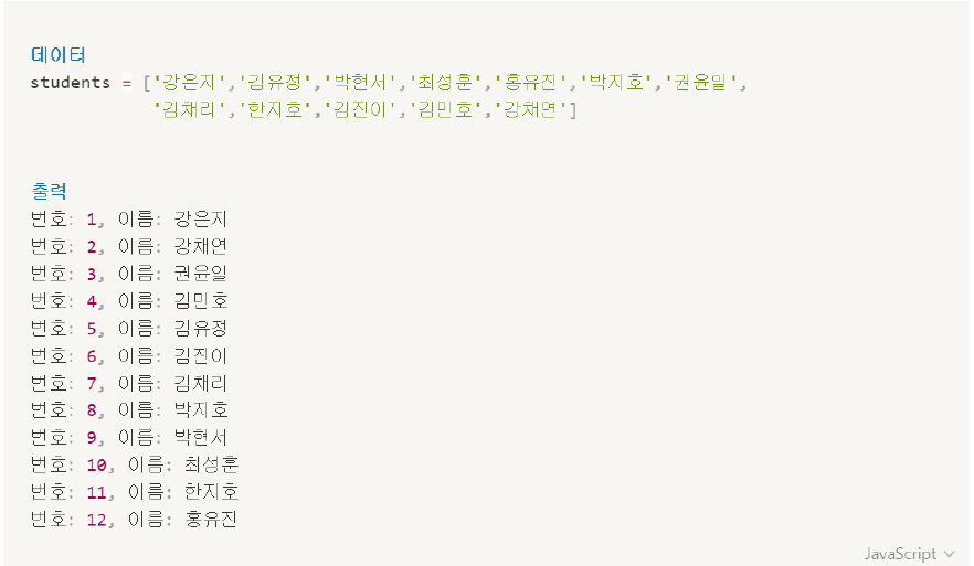 console.log(`번호: ${idx + 1}, 이름: ${student}`);