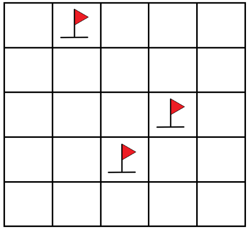 지뢰를 찾는 문제입니다. 다음 그림처럼 깃발 주위에는 지뢰가 사방으로 있습니다. 깃발의 위치를 입력받아 지뢰와 함께 출력 해주는 프로그램을 만드세요.