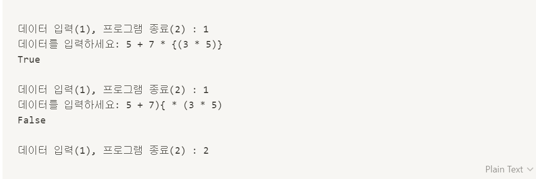 * 소괄호와 중괄호가 있는 수학공식이 제대로 괄호의 짝이 맞는지 반환하는 함수