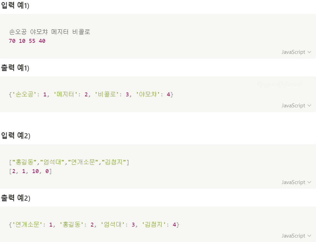 * @returns {object} key:선수, value:등수 를 가지는 object return