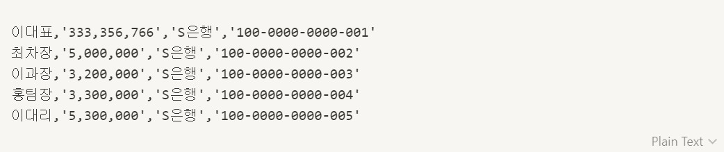 2. 입력값의 형식은 csv파일형식이며 이과장,'3,000,000','S은행','100-0000-0000-0000' 형식으로 주어집니다.