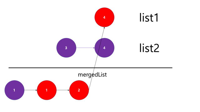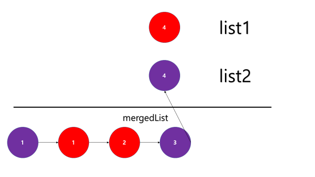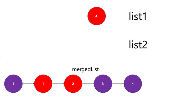 마지막에 list1의 4가 연결되지 않고 list1에 남은채로 반복문이 끝나게 된다.