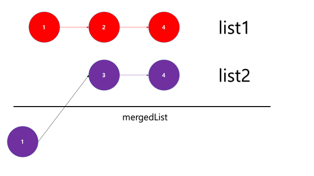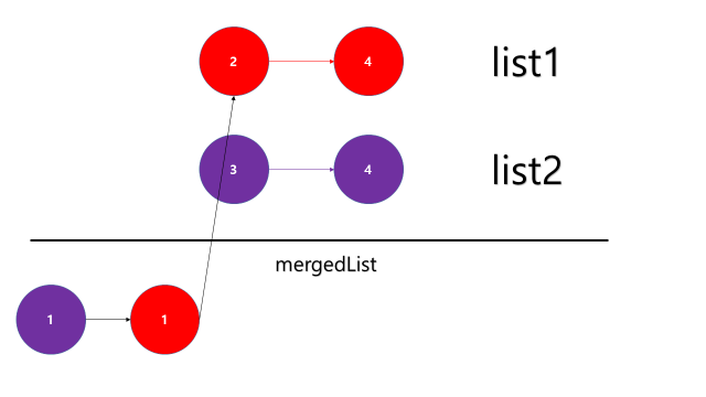 그리고 list1.val과 list2.val을 비교해서 작은쪽을 mergedList.next와 연결시켜주었고, list1은 list1.next, 즉 다음 노드로 연결시켜주었다. 한마디로 작은 값인 노드를 mergedList와 연결시켜주고, 원래 연결되어있던 곳과 연결을 끊는것이다.