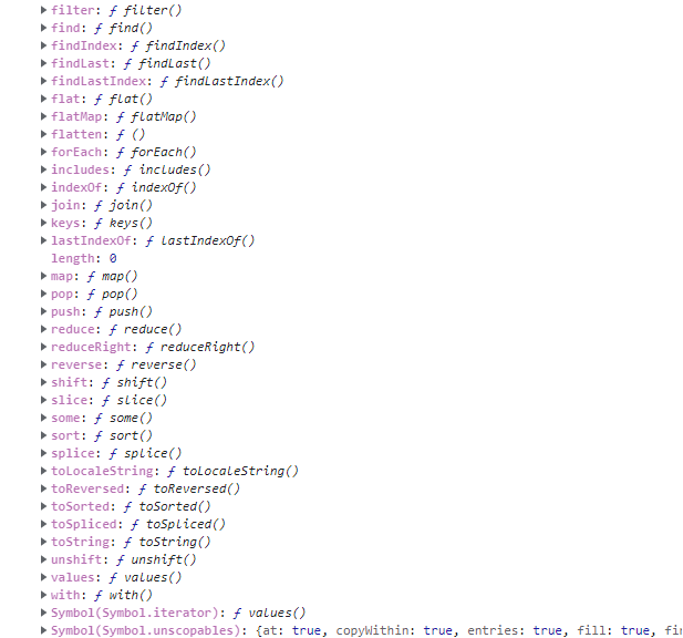 아래는 console.dir(Array.prototype)을 한 결과이다. 맨 끝쪽에 가면 Symbol.iterator가 존재한다는 것을 알 수 있다.