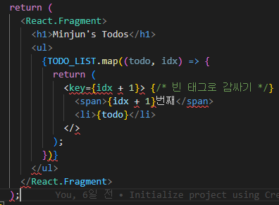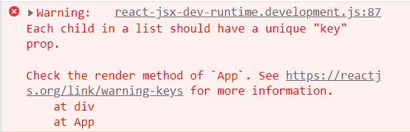바로 .map()에서 반환하는 요소에 key가 없다는 것이다. 그래서 다음과 같이 고쳐줘야 한다. (임의로 인덱스를 key로 사용하자)