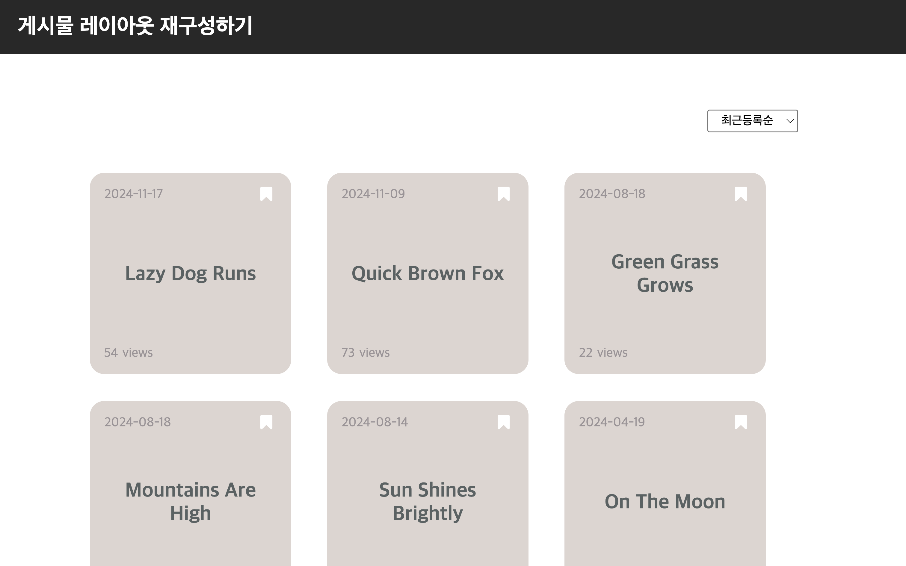 테이블 형태로 나열되어 있는 게시물 조금 더 보기 좋게 카드 형태로 레이아웃을 수정하고, 정렬 및 북마크 기능을 추가하려고 합니다.