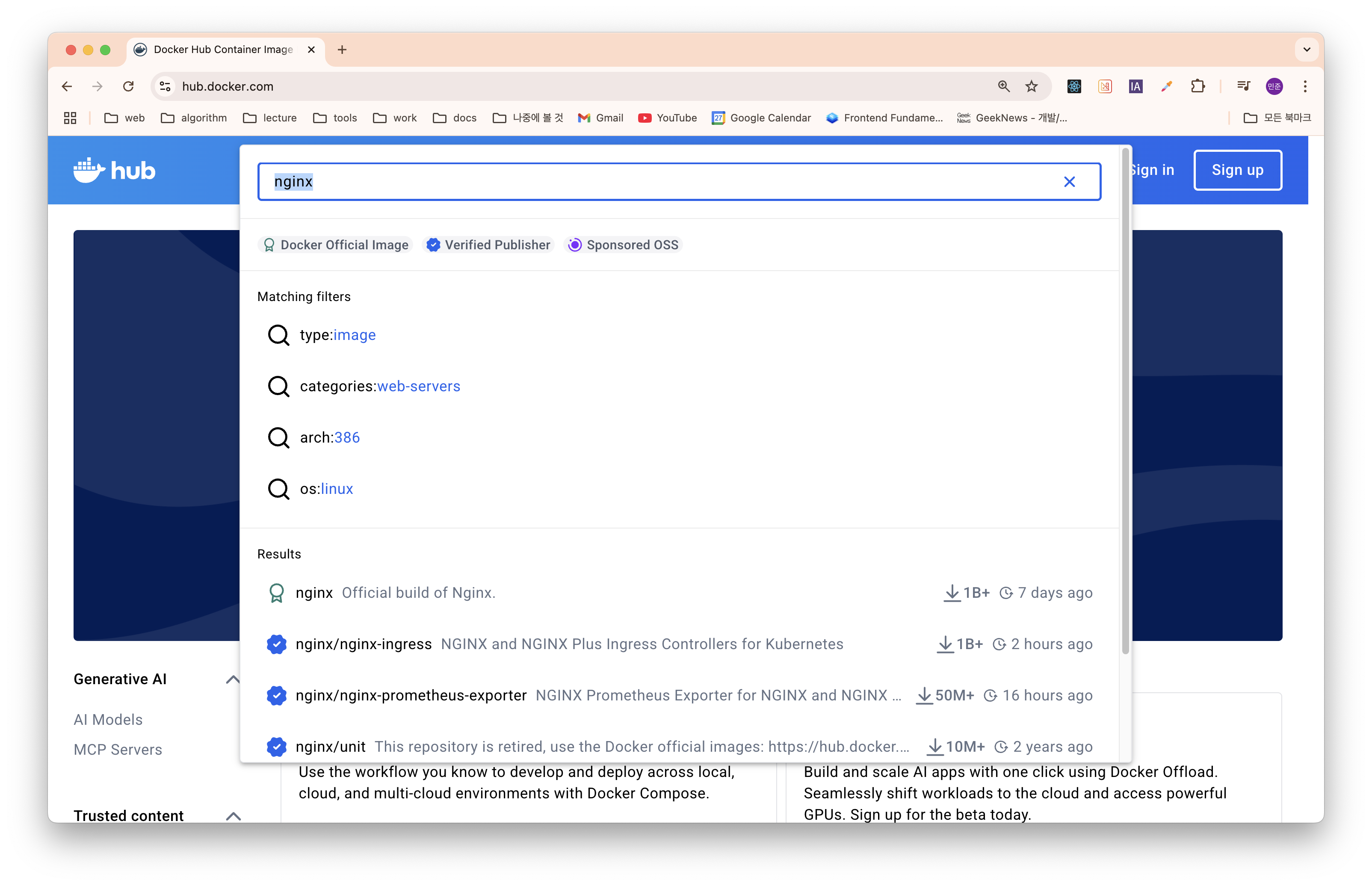 그럼 다음과 같이 dockerhub에서 nginx를 검색한다.