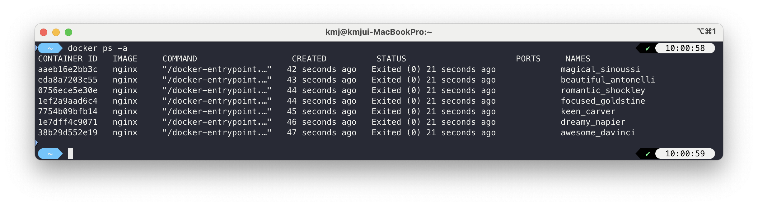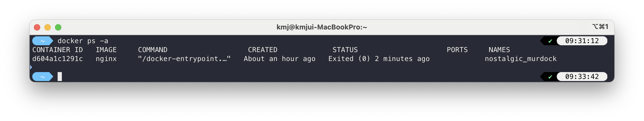 실행중인 컨테이너, 중지된 컨테이너 '모두' 포함해서 조회하는 명령어이다.