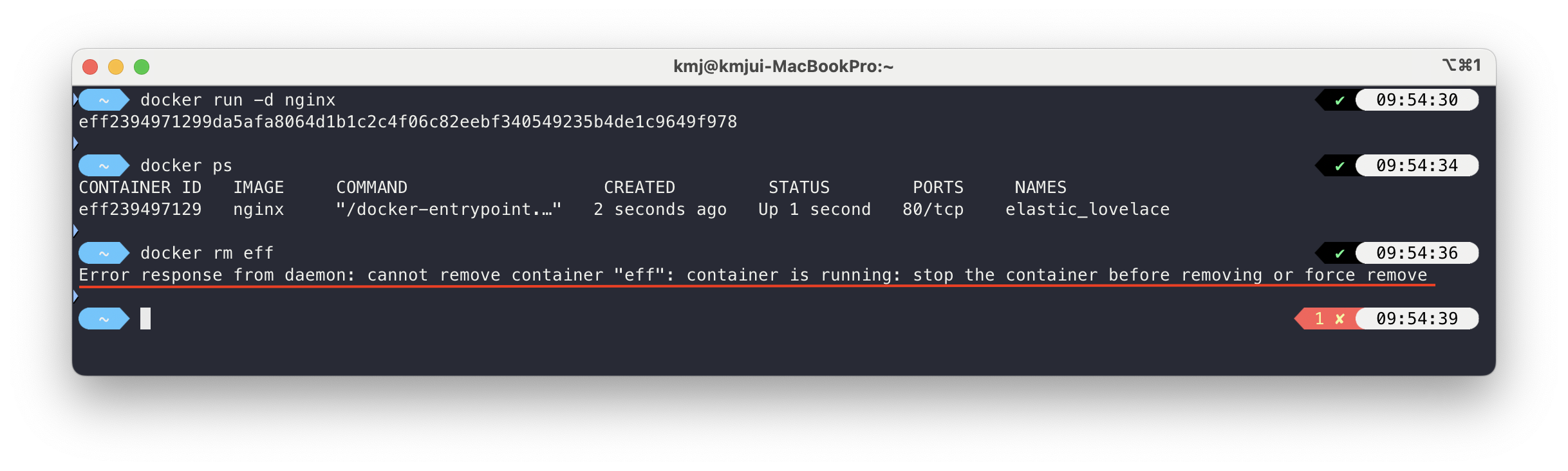 에러메시지를 보면 컨테이너를 지우기 전에 컨테이너를 중지하라고 나온다.