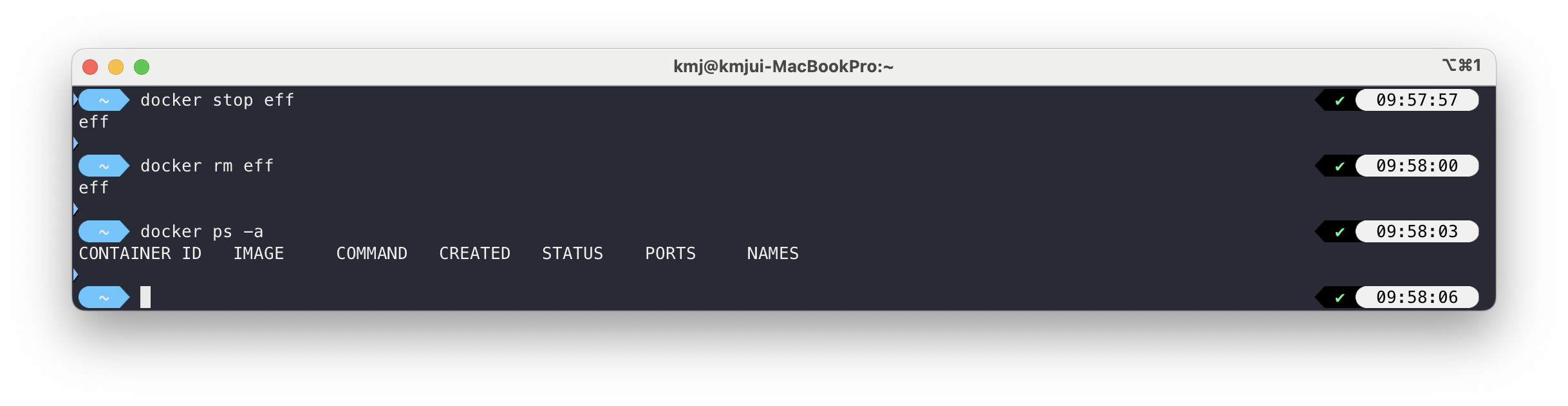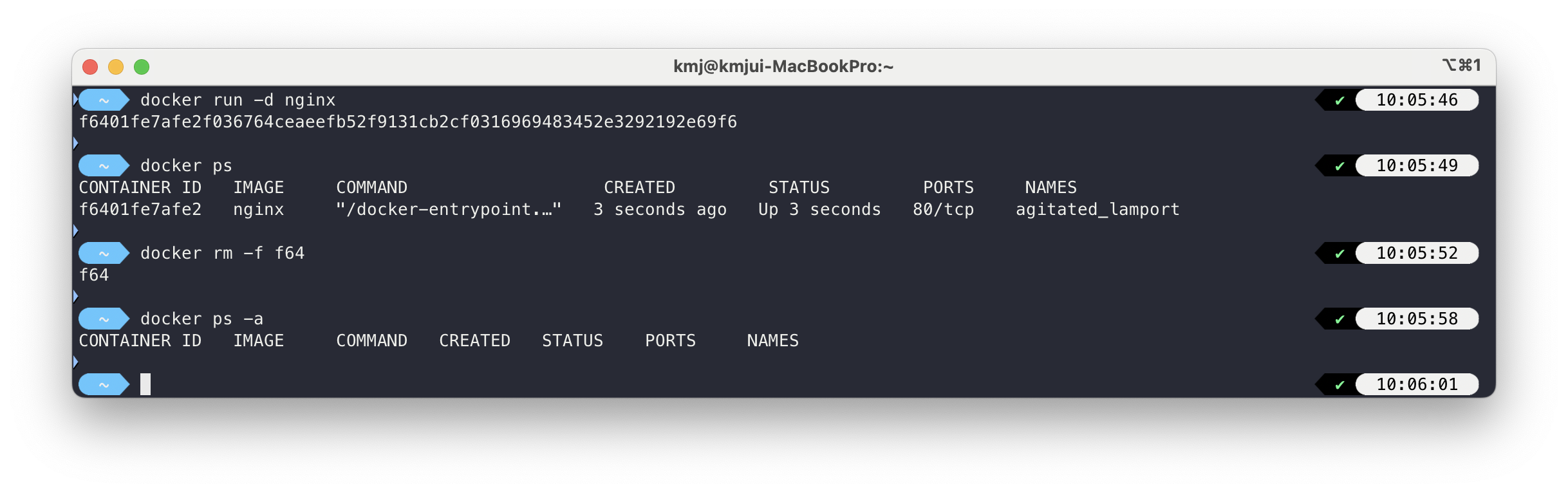 마지막으로, 실행 중이던 컨테이너를 바로 삭제하는 법은 다음과 같다.