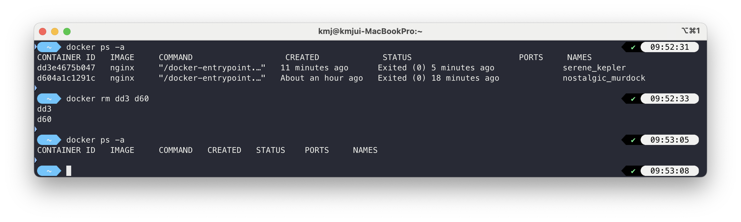 이렇게 중간에 공백을 두어서 여러 컨테이너를 한 번에 지울 수도 있다.