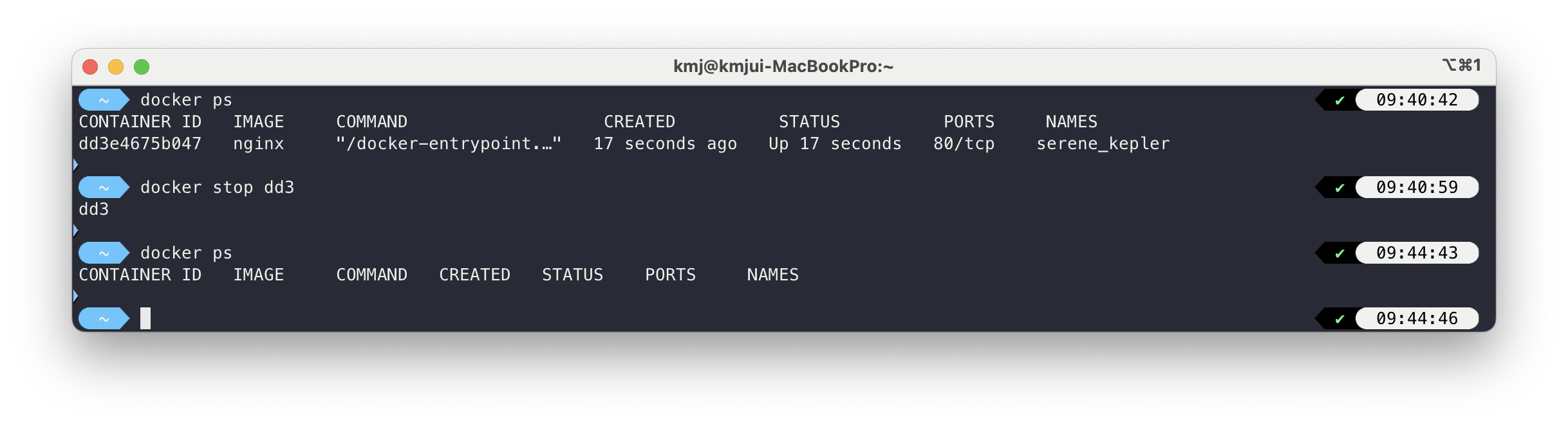 컨테이너를 중지하기 위해서는 다음 명령어를 사용했었다.