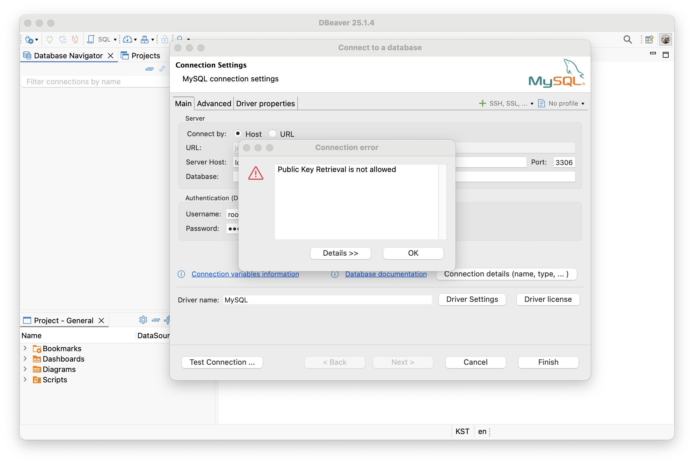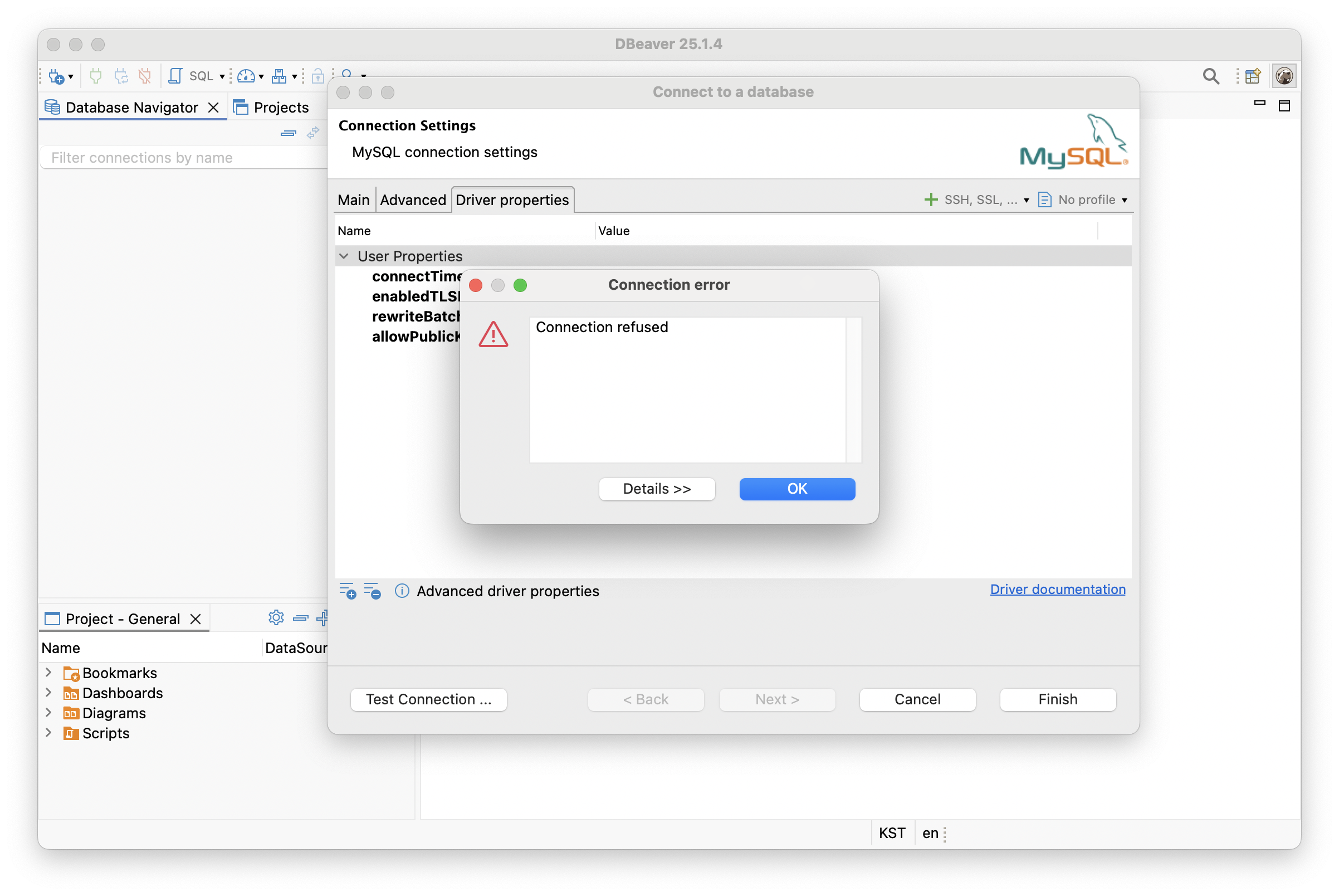 다시 'Test Connection'을 해주면 아래와 같은 에러가 뜰 수 있다.