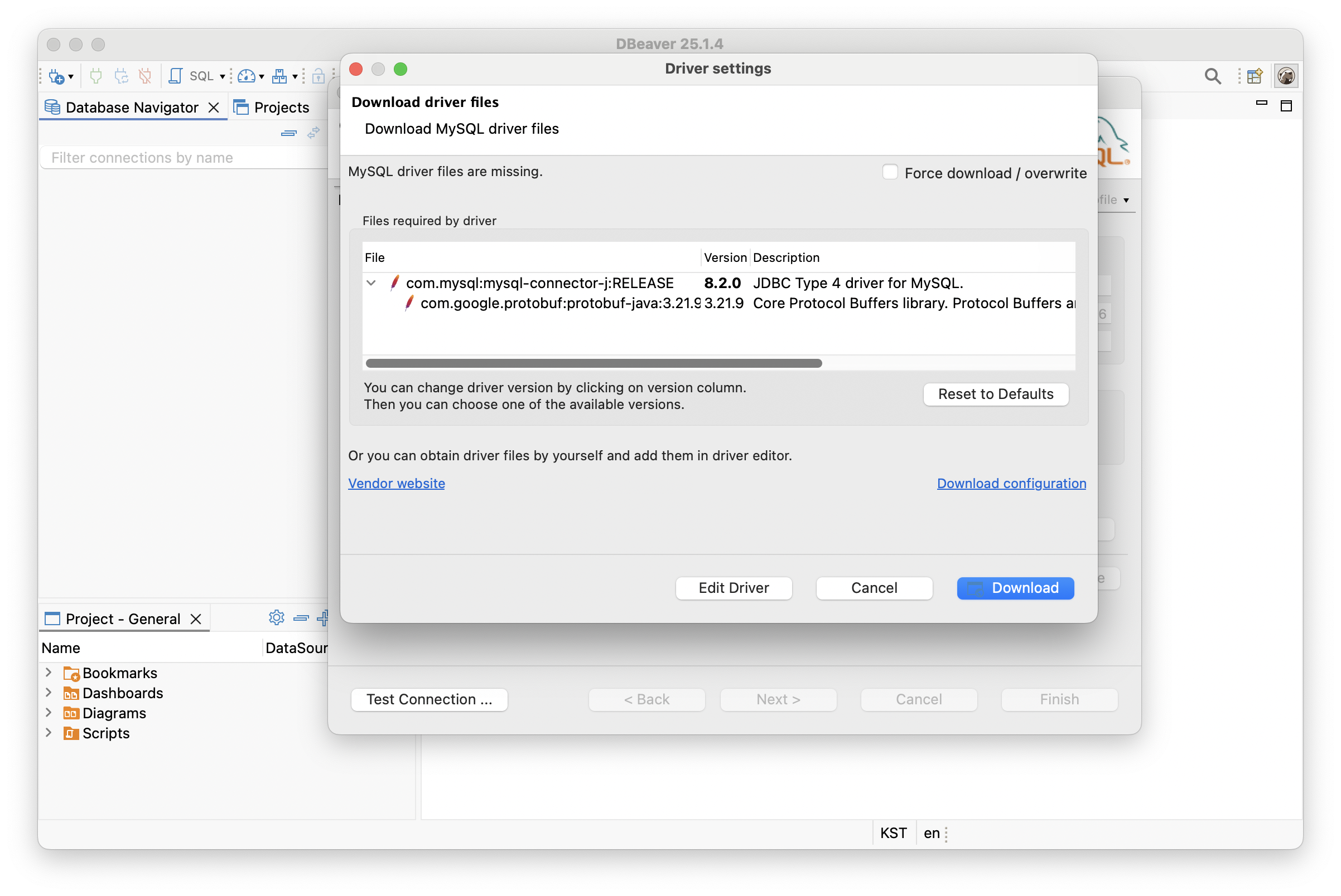 그러면, MySQL 드라이버가 없다고 다운로드 하라고 뜨는데 다운로드 해주자.