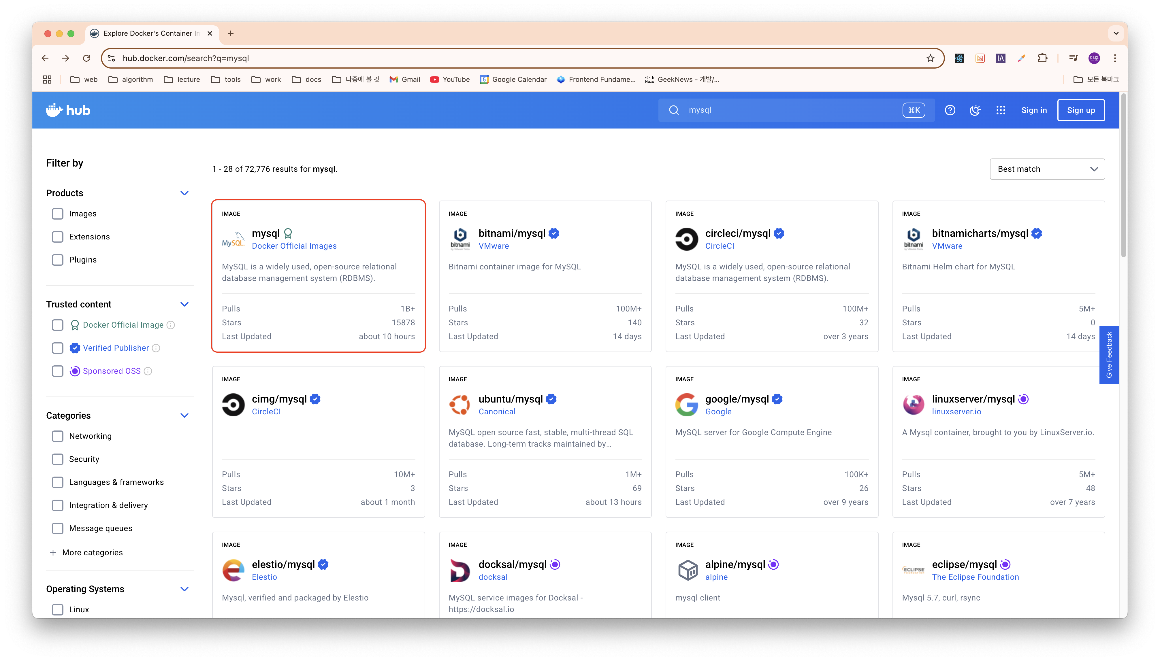Docker Hub에 들어가서 MySQL 이미지를 먼저 검색해보자.