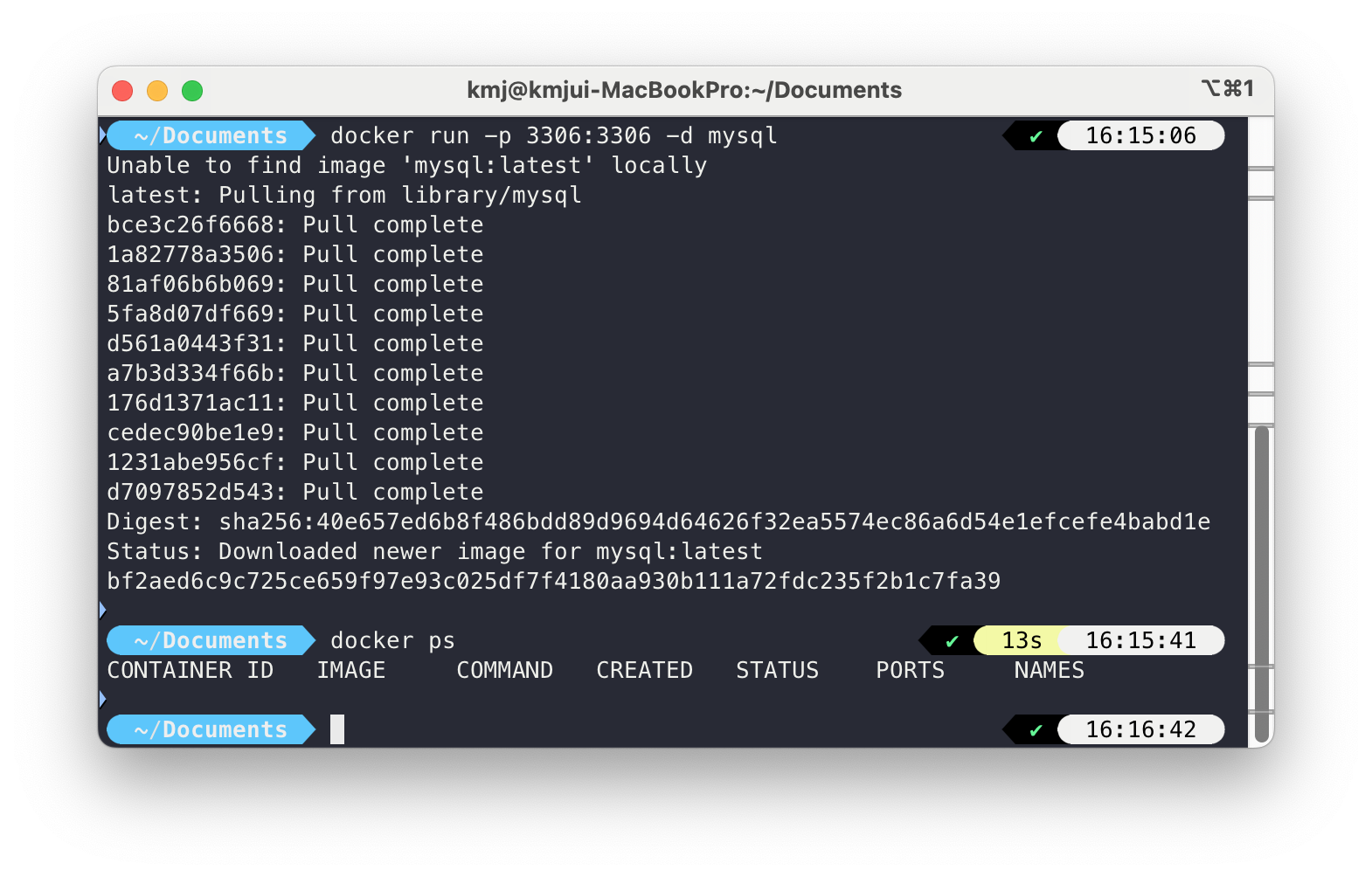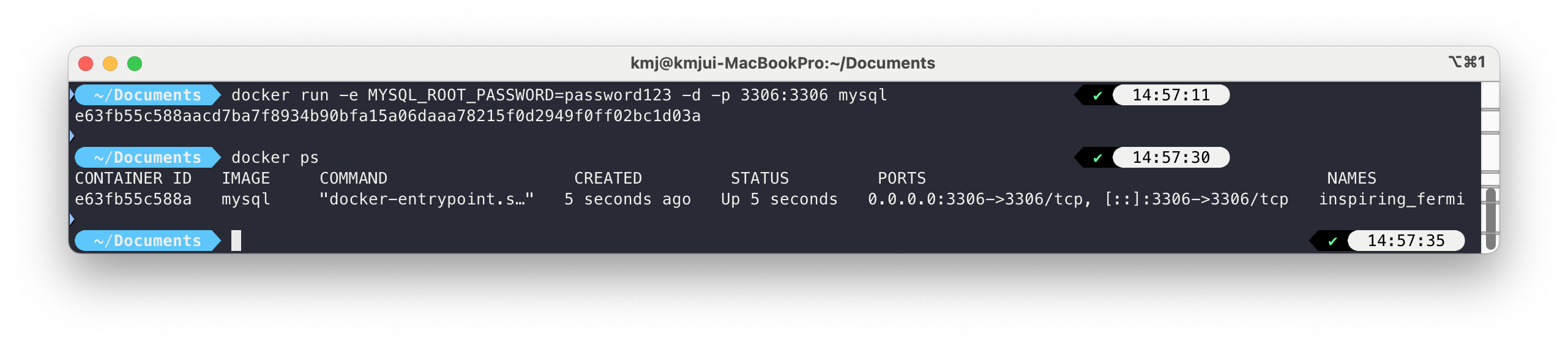 docker run -e MYSQL_ROOT_PASSWORD=[비밀번호] -d -p 3306:3306 mysql
