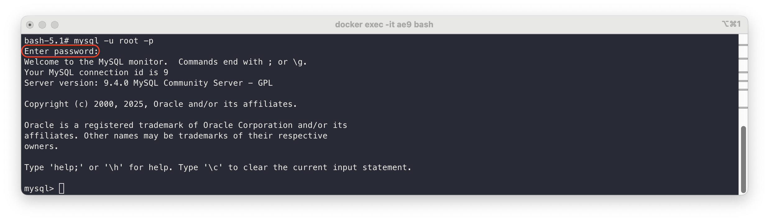 컨테이너에 접속했으니, MySQL에 접속해주자.