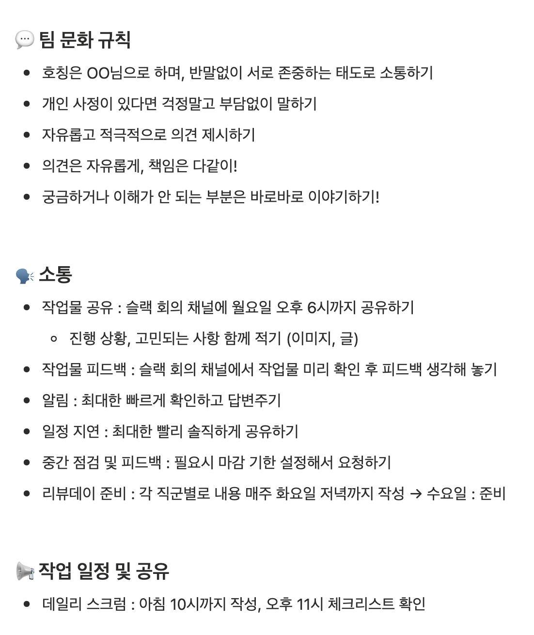 팀 문화 규칙, 소통같은 부분은 어쩌면 당연하다고 생각될 수 있겠지만,