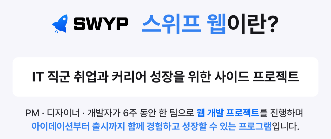 실전 프로젝트로 배우고 협업하며 성장하는 IT 커리어, 스위프에서 포트폴리오와 실무 역량을 완성하세요.