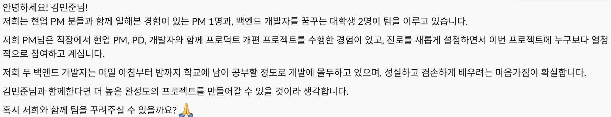 감사하게도 PM 님이 있는 팀에서 먼저 연락이 와서 같이할 수 있게 되었다.
