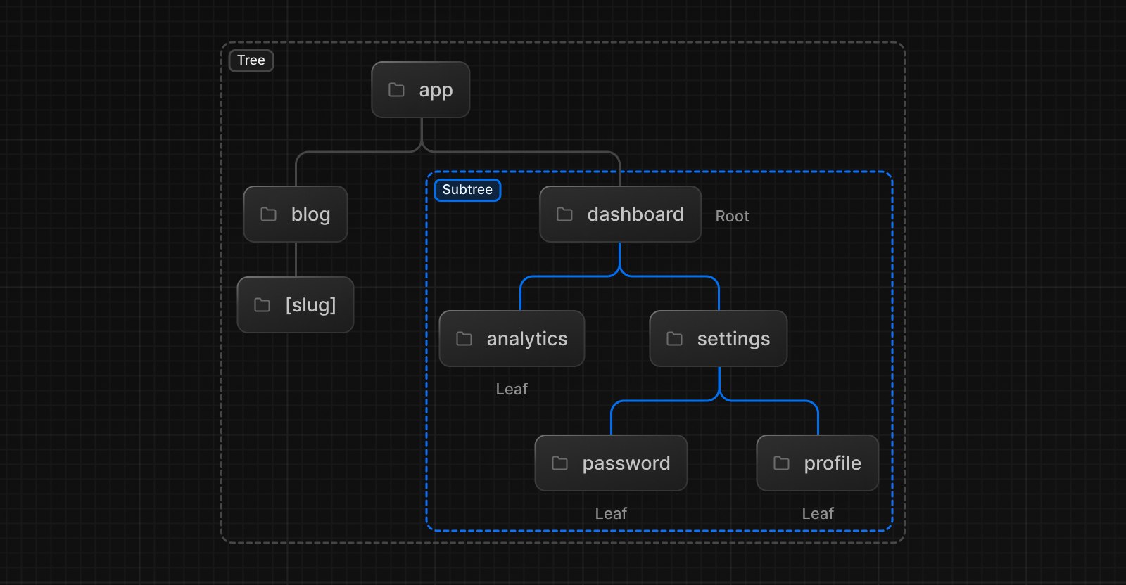 • Leaf: URL 경로의 마지막 부분 같은 자식이 없는 서브트리의 노드이다.