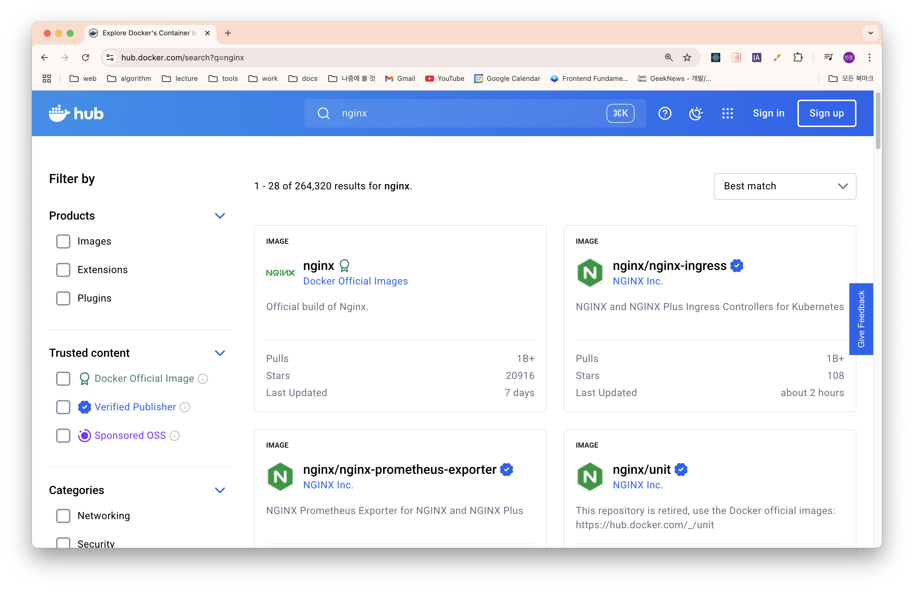 그럼 다음과 같이 dockerhub에서 nginx를 검색한다.